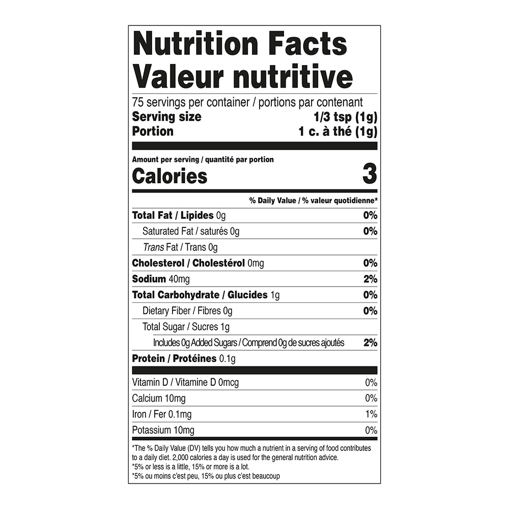 Ingredients: Dehydrated vegetables (garlic, onion), Spices, White vinegar powder (maltodextrin, white distilled vinegar, modified food starch), Sea salt, Organic rice hulls.