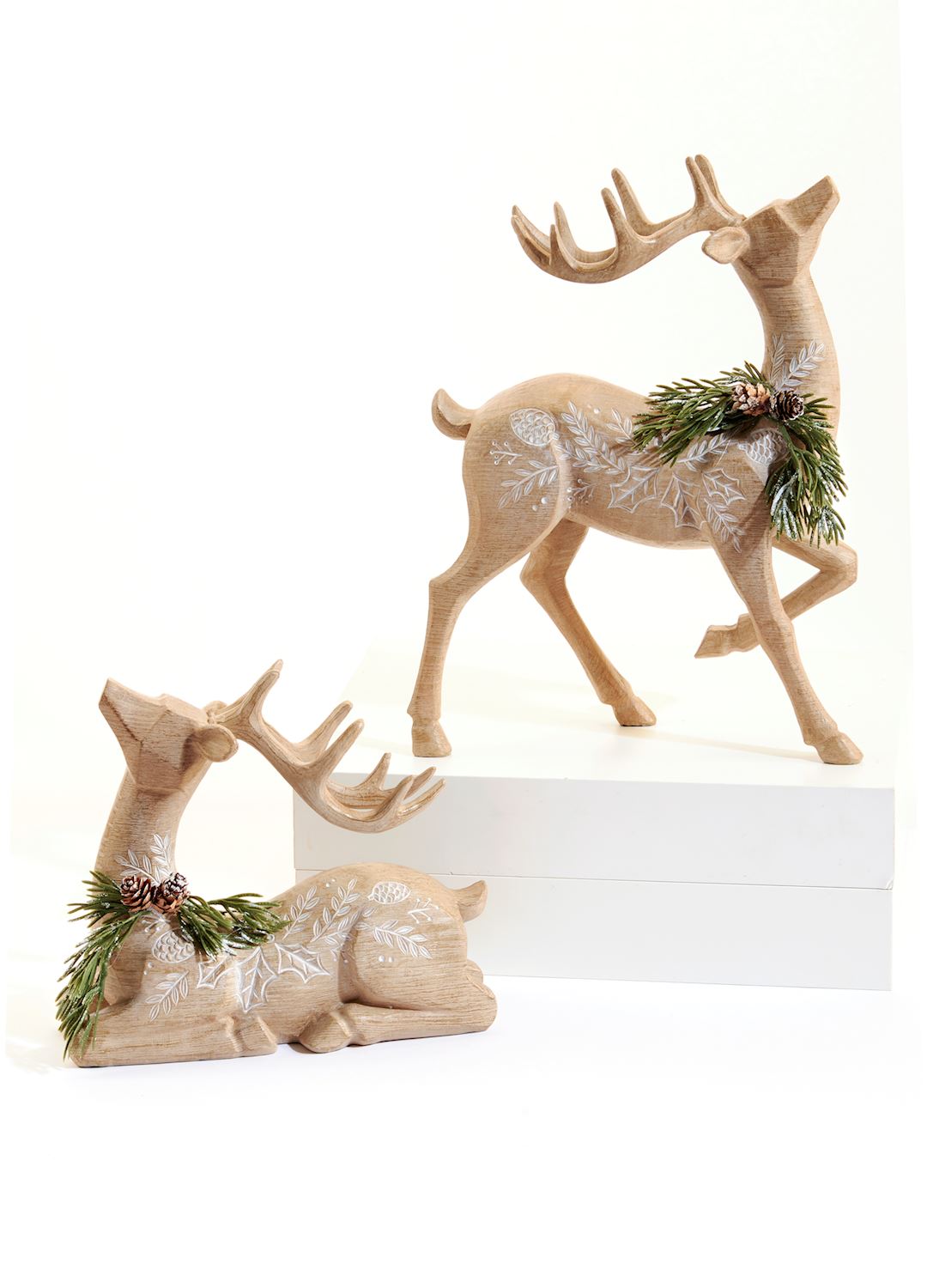 Add to your holiday decor with this poised reindeer figurine, accessorized at the collar with a decorative wreath. Two Styles, Standing or Sitting