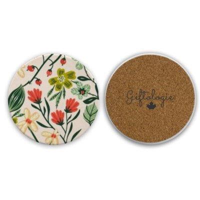 Coasters are made of porcelain and are a matte finish. The back side is finished in cork. All printing is done in studio and baked into the ceramic with a permanent dye process.