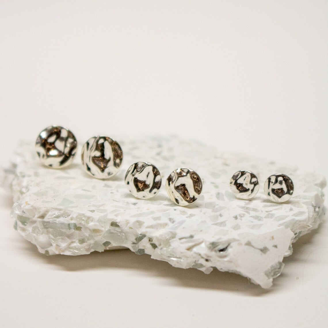 Description: On one of my many travels flying from Iceland to Yukon, I came to realize that the mountains displayed a unique texture, as per a topographic map. This distinctive texture reminded me of a technique I use called reticulation, thus the Topographical Series was created. The series has expanded in pieces over the years, however, the Topographical Stud Earrings remain as one of the most popular stylish pieces. Each pair is unique based on how the technique affects the sheet of silver.