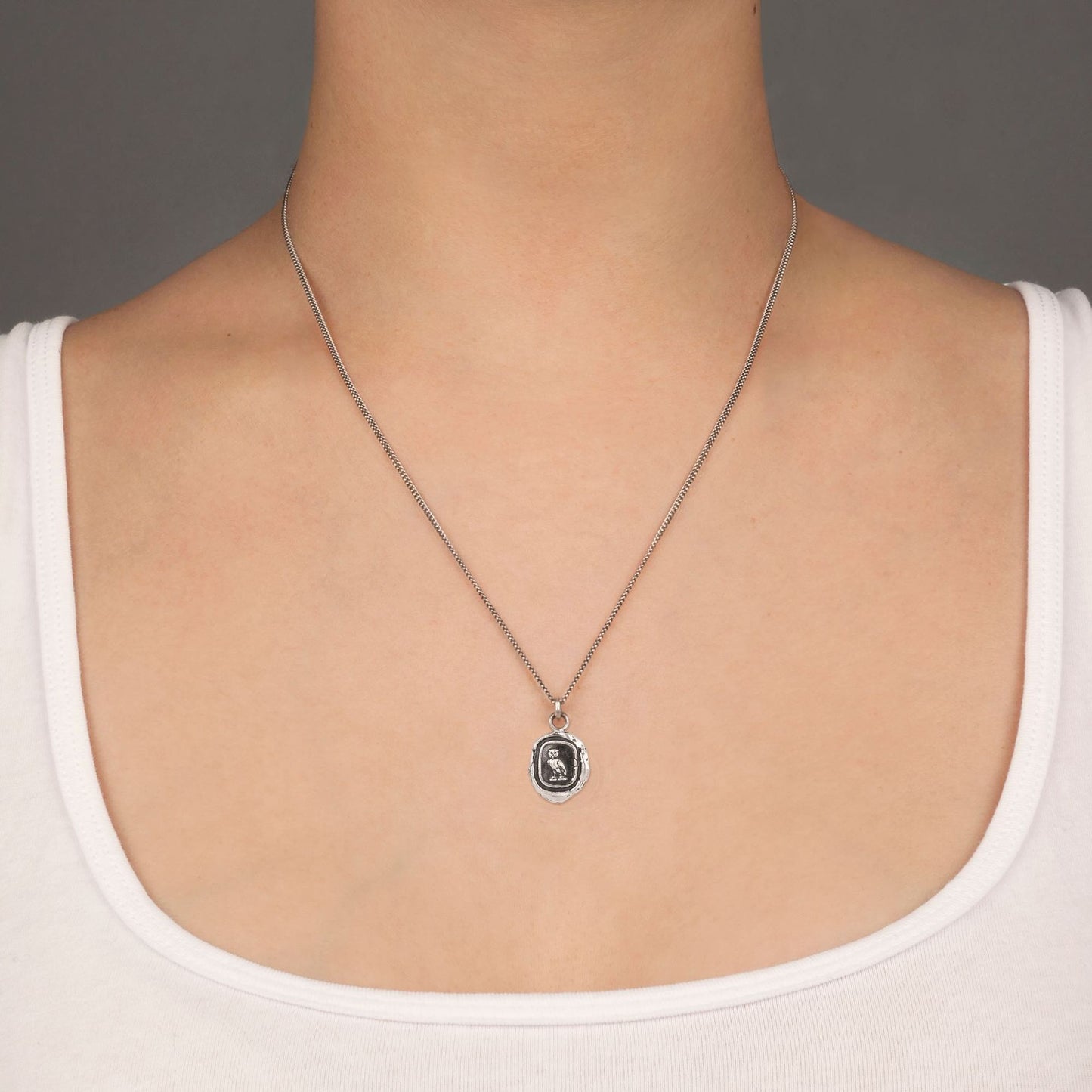 The great horned owl is a warrior bird representing strength, courage, and wisdom. Depicted facing forward on this talisman, the owl vigilantly watches over loved ones.