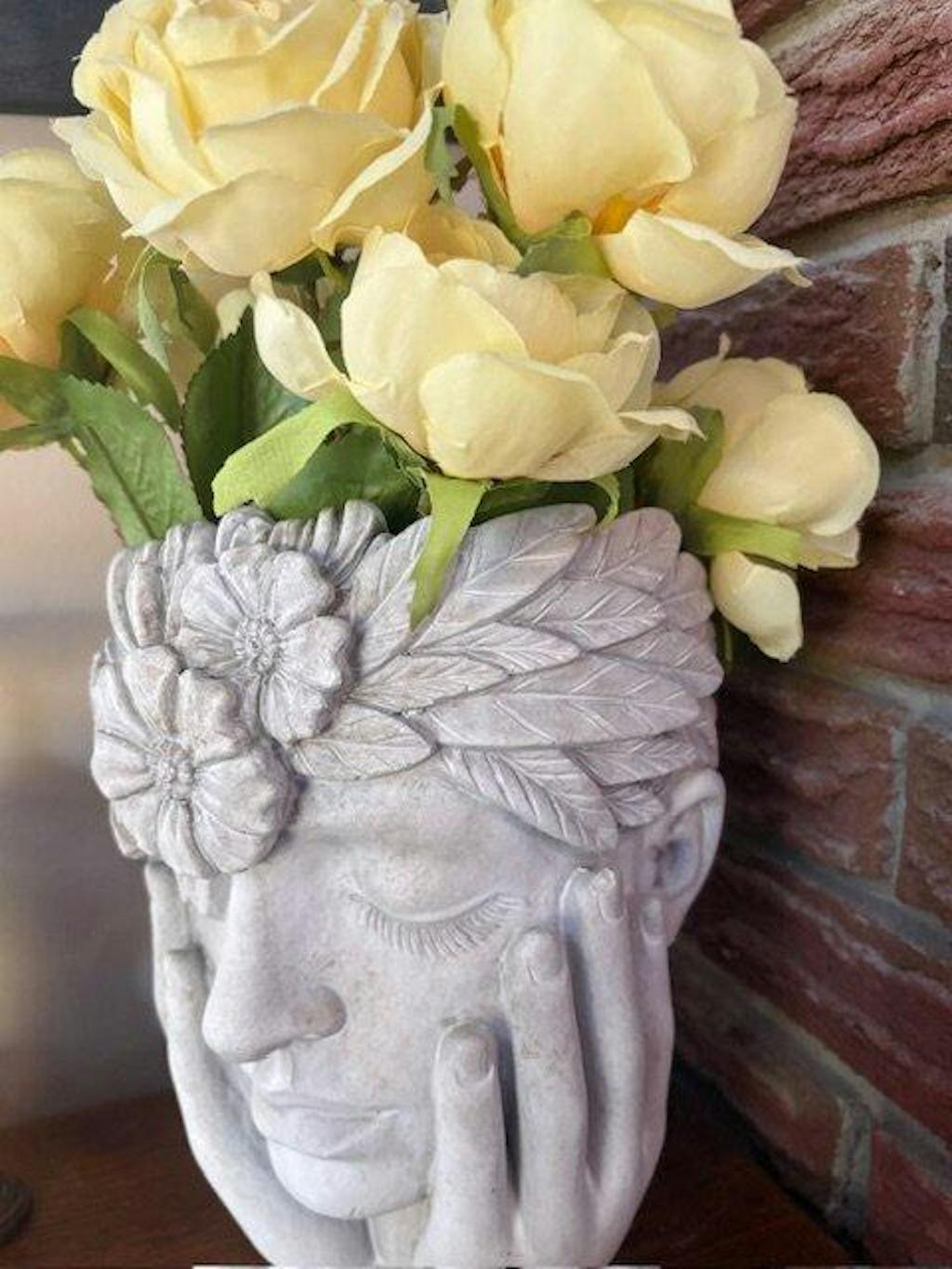 Add some intriguing classical sculptural style to your favourite plant or blooms with this striking Woman with Flower Halo Planter. Crafted out of cement, the picturesque sculpt of the woman's face, hands and floral crown make an elegant accent to any manner of plants, flowers or blooms. Flowers not included
